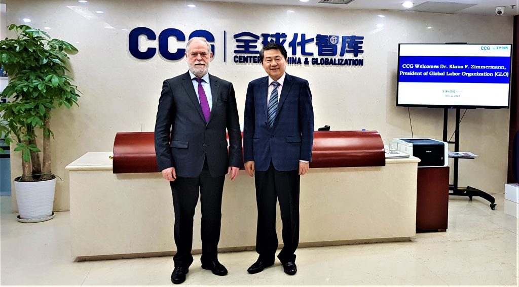 In the morning of December 12, the Beijing-based Center for China and Globalization (CCG), a leading non-governmental think tank in China dedicated to the study of globalization, received GLO President Klaus F. Zimmermann. CCG President Henry Wang (also a GLO Fellow) and his staff discussed cooperation issues of joint interest. With immediate effect, CCG joins the group of supporting institutions of GLO.